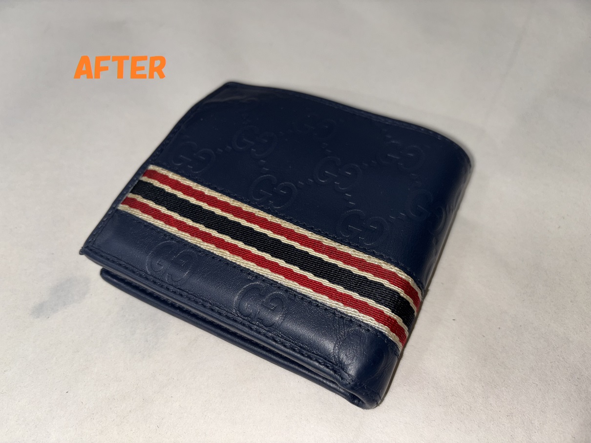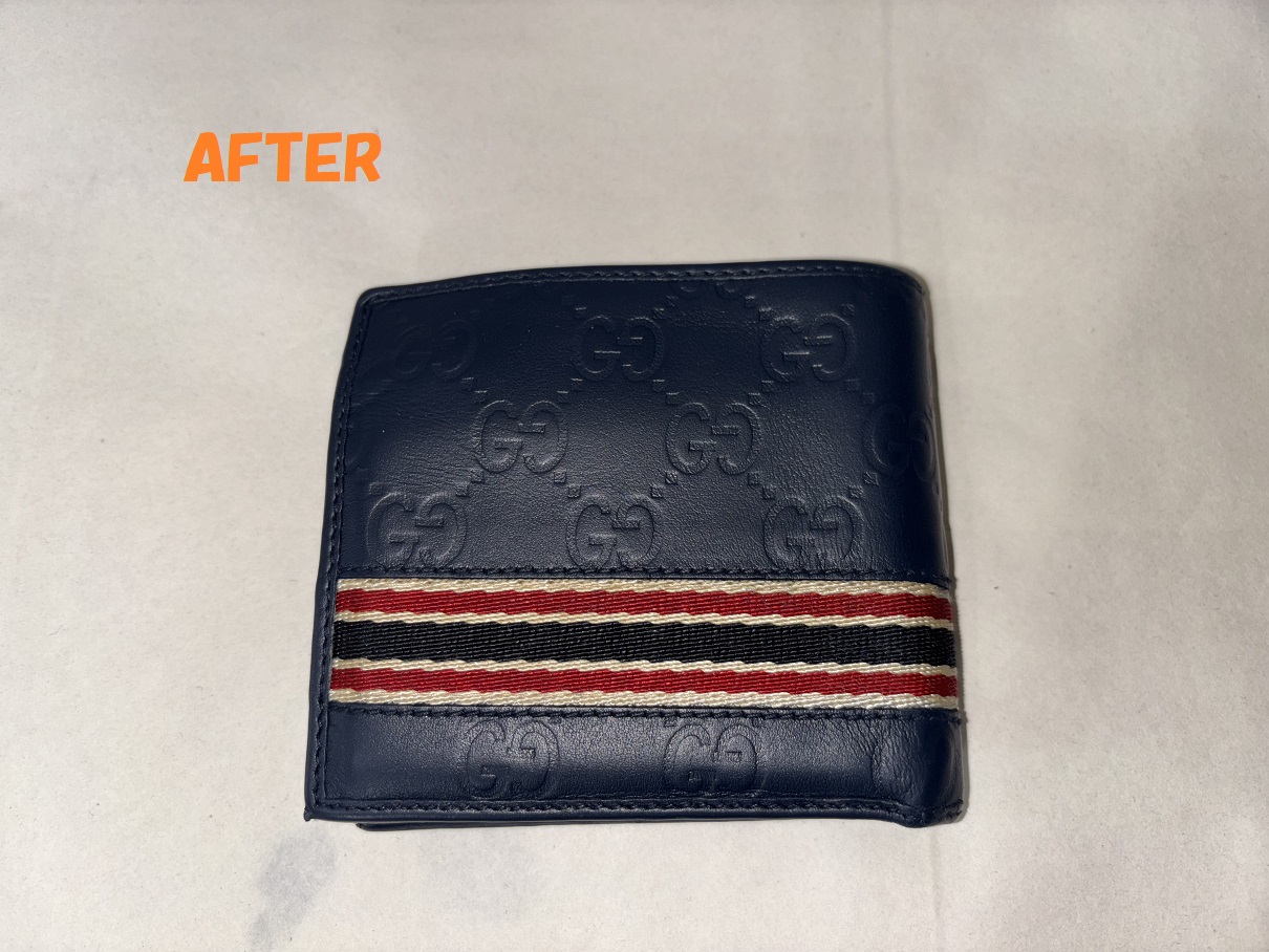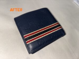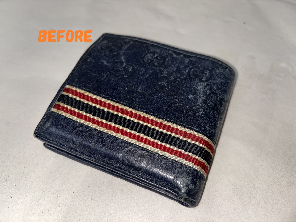 GUCCIグッチの二つ折り、ネイビーのお財布のスレの補修、お色の剥がれの補修、染め直しのご依頼を頂きましたので、ご紹介させていただきます(^^)