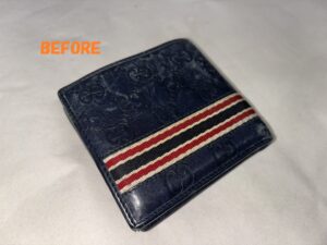 今回ご依頼を頂きましたのは、GUCCIグッチの二つ折りのお財布になります。お色はネイビー系で全体的にこすれてしまってお色の剥がれが気になる状態になっていました。こちらのお財布を何とかキレイにならないかというご相談を頂きました(^^)お財布を拝見しましたところ、特に大きなキズもありませんでしたので、スレを補修してから染め直しをすることで綺麗に復活させることが出来そうです。
