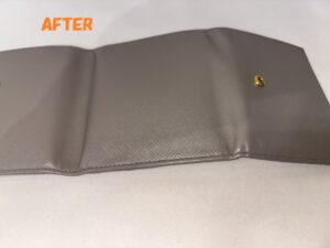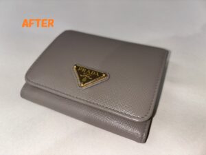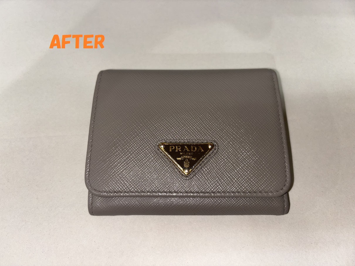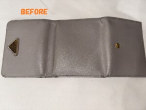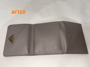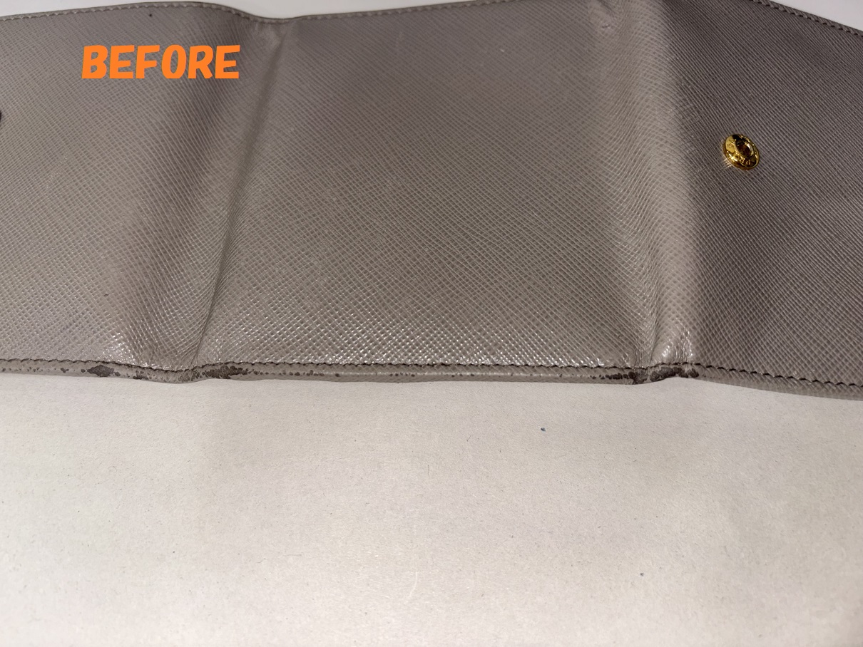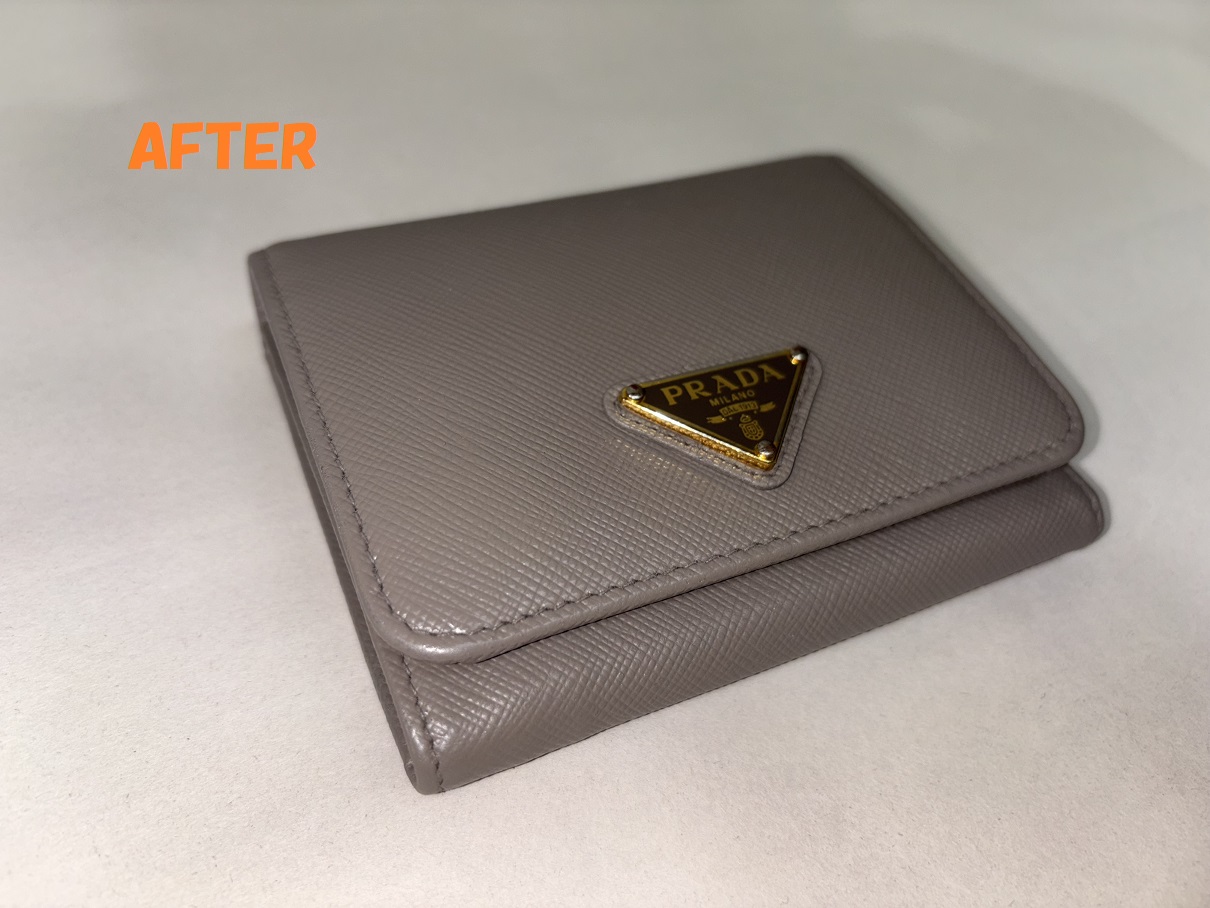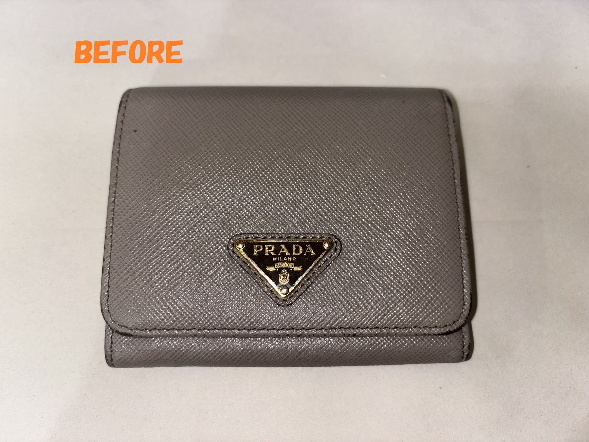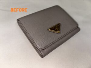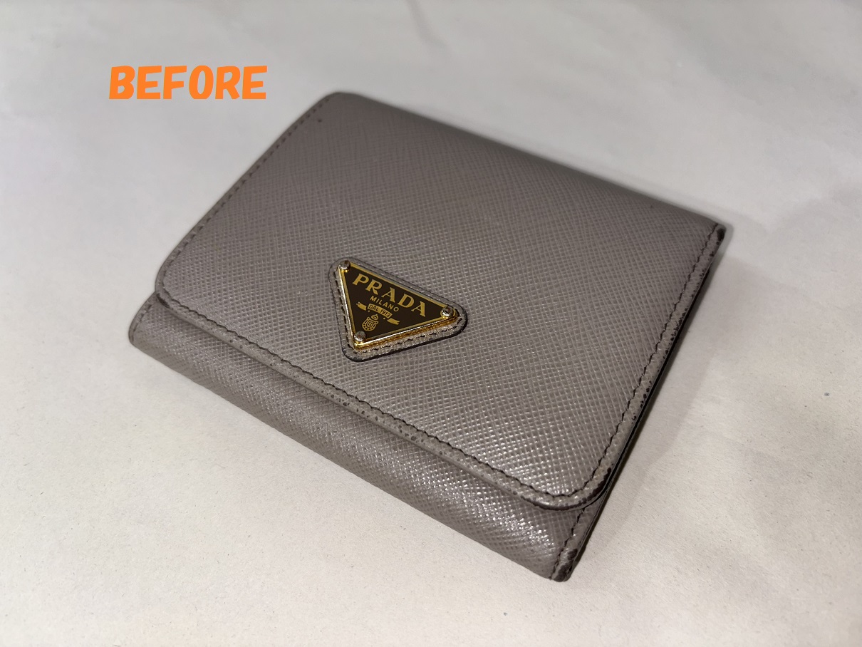 財布修理 PRADAプラダ 折りたたみ財布 サフィアーノレザー 角スレの補修 染め直し
