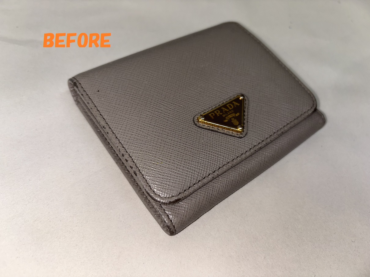 PRADAプラダの折りたたみの財布、サフィアーノレザーの角スレの修理、お色の剝がれの修理、染め直しのご依頼を頂きましたので、ご紹介させていただきます(*^-^*)