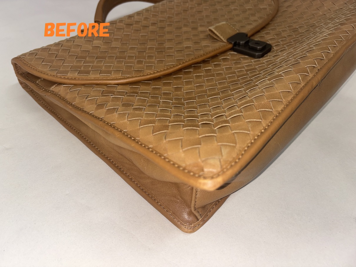 さて、今回のご依頼ですがボッテガヴェネタのビジネスバッグになります(^^)こちらのビジネスバッグですが、全体的に色あせ、色ムラがありまして、フチの部分に巻いてある革が破れてしまっていました。この破れてしまった革はお色の染め直しの前に交換をさせて頂きました(^^)破れてしまったものは交換することもできますので、なんでもご相談してくださいね~(^^)また交換した後に全体を染め直しをすることで違和感なく仕上がります(^^)まずはBEFORE画像をご覧頂きたいと思います~!