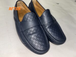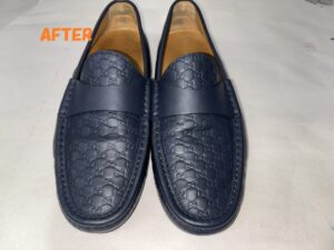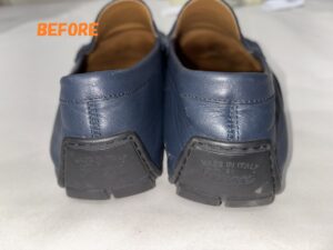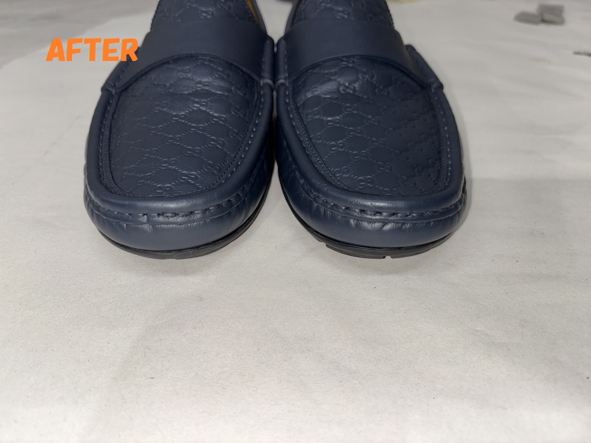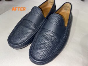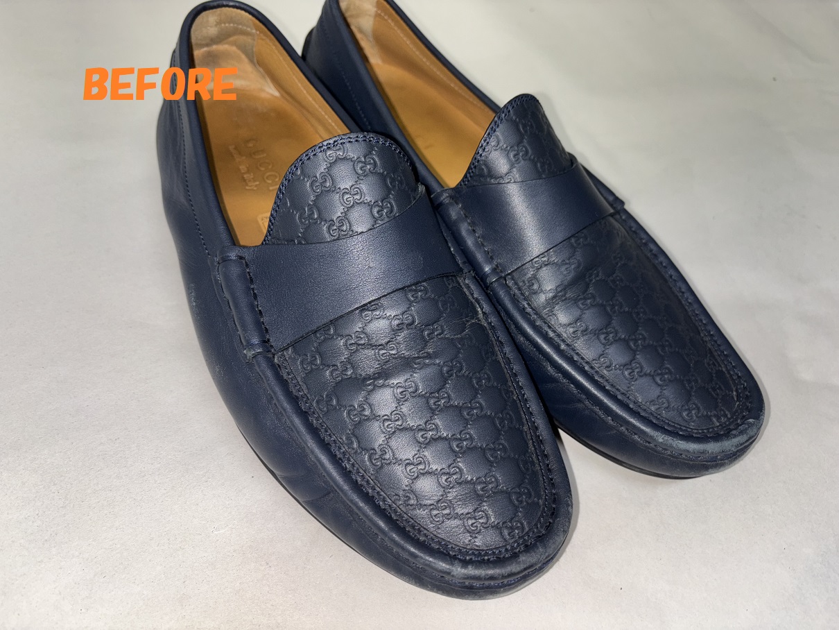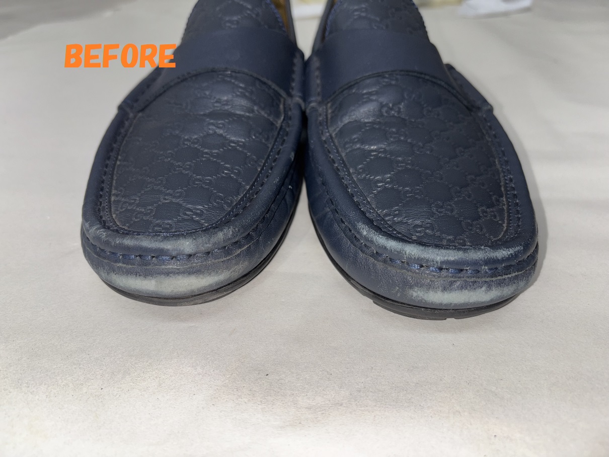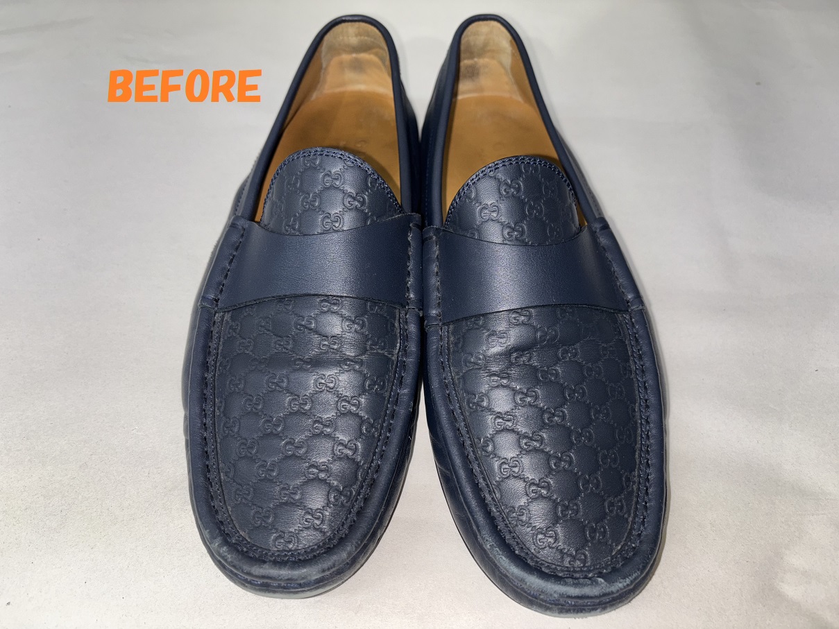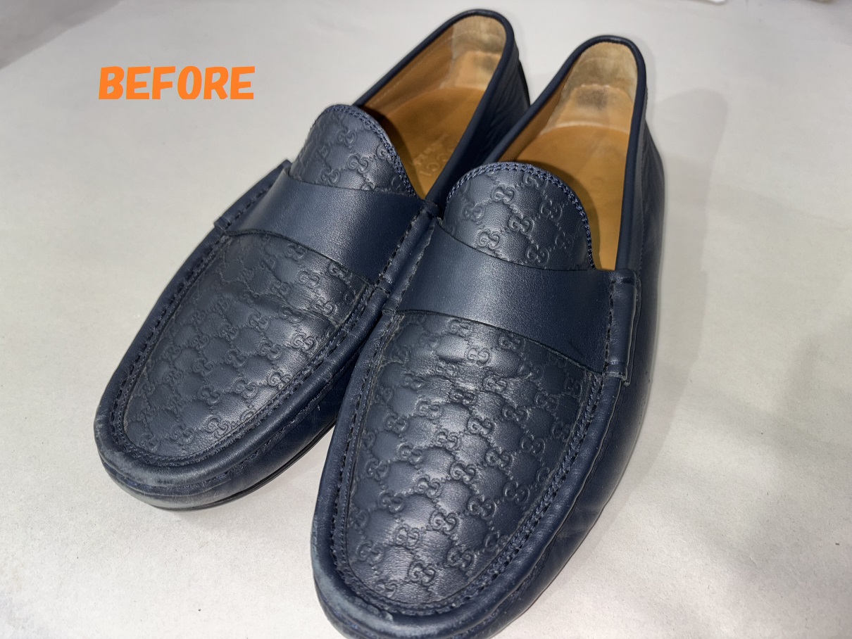 さて、今回のご依頼ですがGUCCIグッチの革靴になります。ネイビーの革靴なのですが、つま先の部分がスレてしまってお色がハゲてしまっていました。スレとお色の剥がれを何とか修理できないかとご相談を頂きました。お客様は店頭に来ていただきましたので、実物を確認し、状態を確認させて頂きました。拝見しましたところ、ひどい傷や破れなどはありませんでしたので、スレを修復し、染め直しをすることで綺麗に復活させることが出来そうです(^^)お客様にお話し、ご依頼を頂けることになりました~!!ありがとうございます。