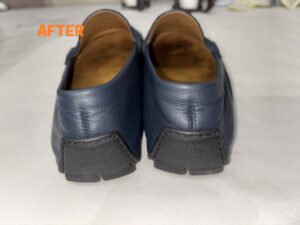 1回目の染めがキレイにできていましたので、次は仕上げの染めの工程に入ります。仕上げに使う塗料を調色して、色止め材を加えて、ツヤ感も調整します。もともとのお預かりしたときのようなツヤ感に調整させて頂きました!!塗料の調合が出来ましたので、靴に塗布していきます。塗布するとお色もさらにキレイになり、ツヤもいい感じになっていきました。全体がキレイに染まったら、これで染め直しの作業完了です~!!