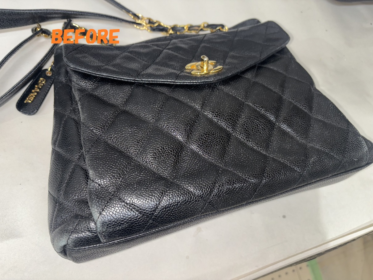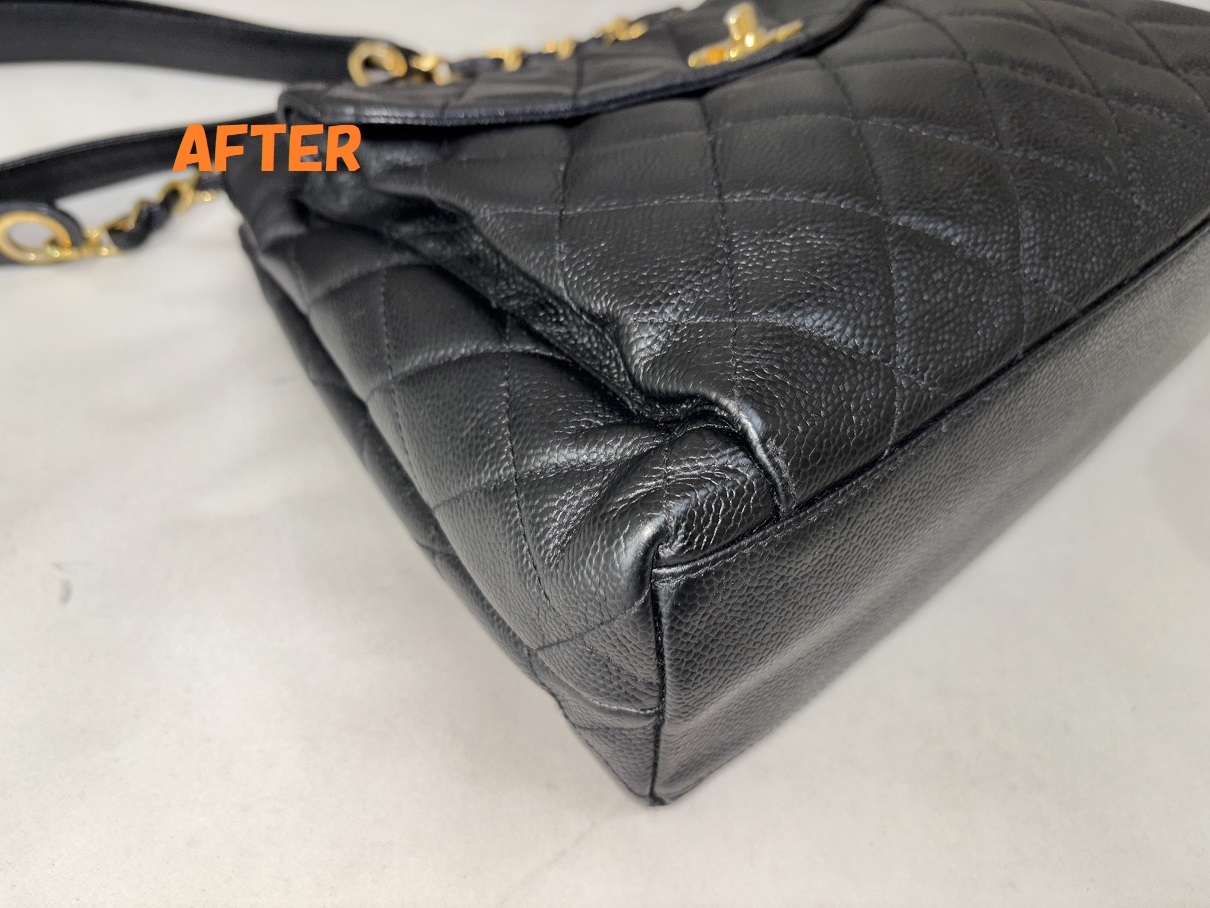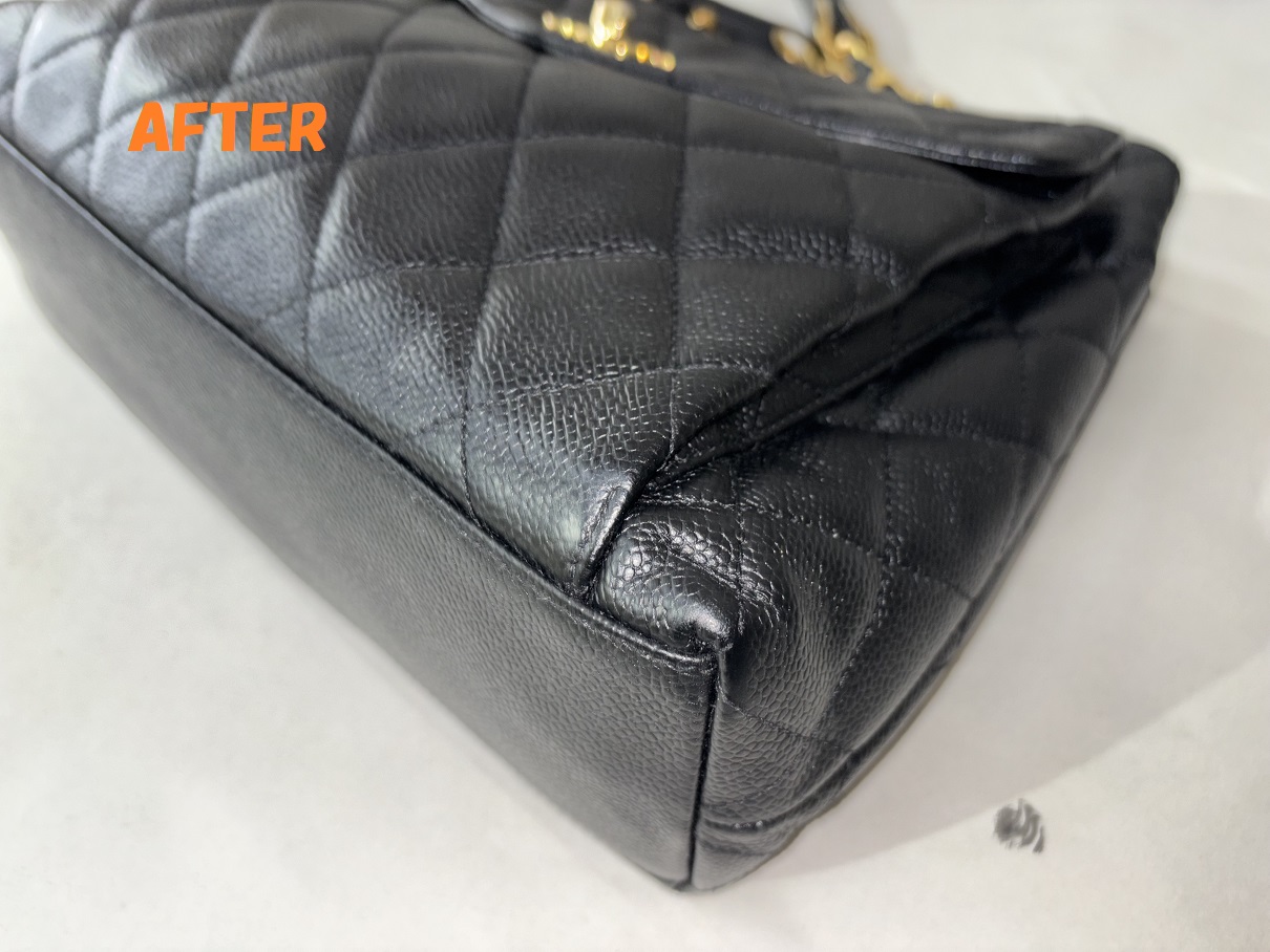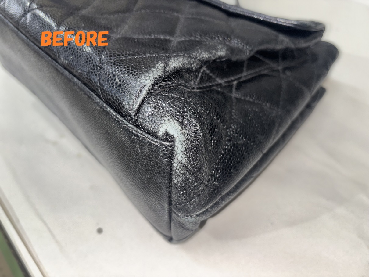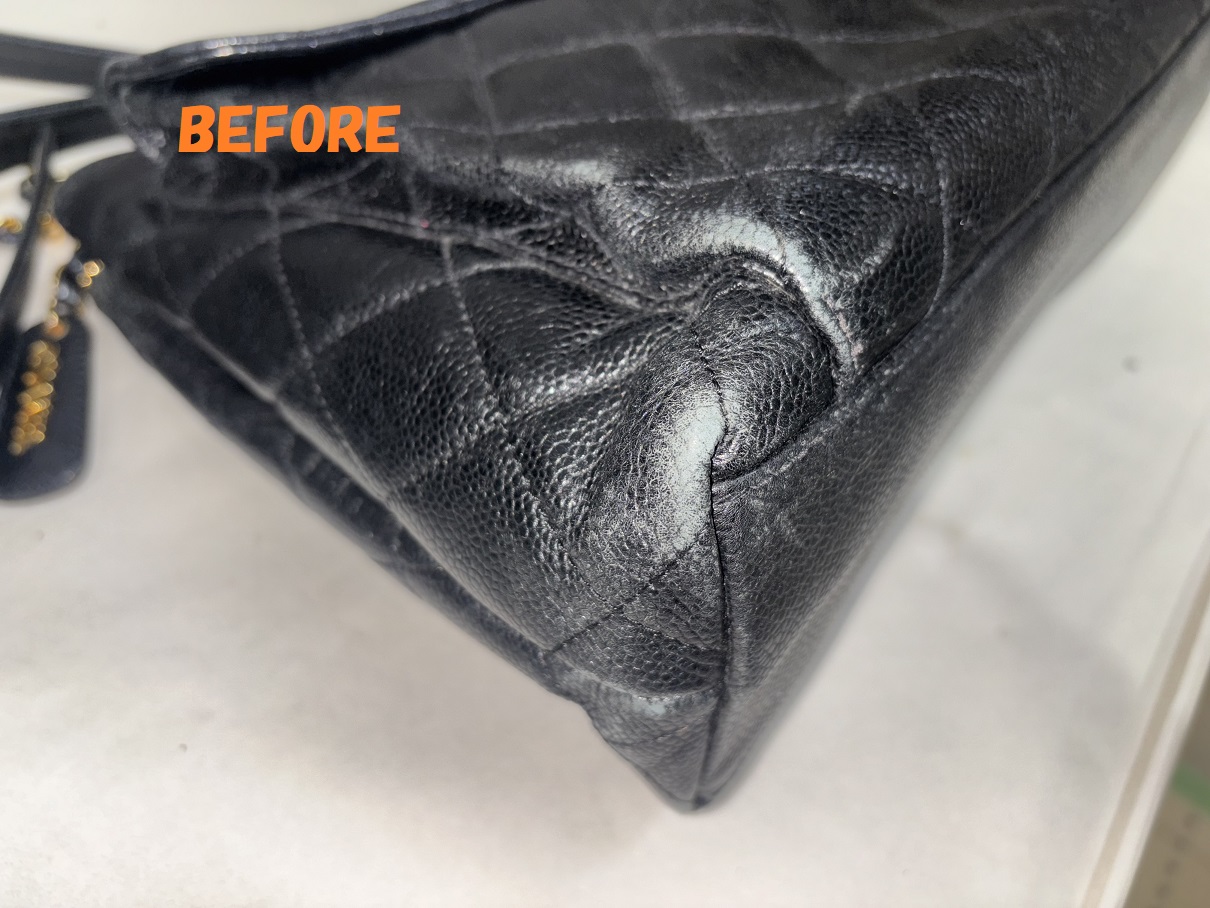 カバン修理 CHANELシャネル キャビアスキン ショルダーバッグ 角スレの補修 染め直し