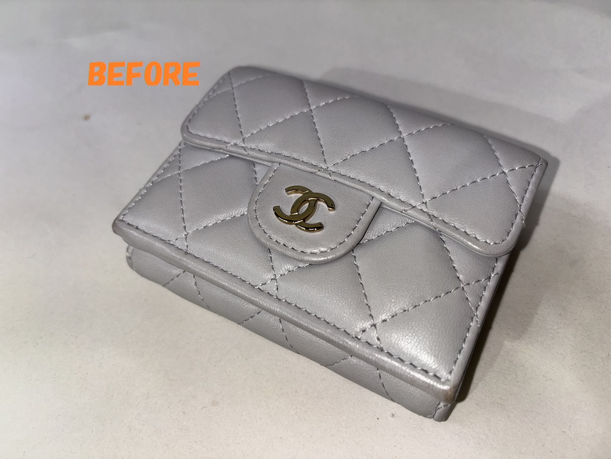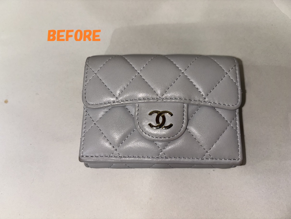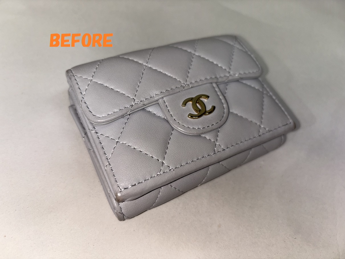 さて、今回ご依頼を頂きましたのは、CHANELシャネルのラムスキンのお財布になります。折りたたみのお財布でお色はライトグレーといった感じです。比較的キレイな状態ではありましたが、角部分が少しこすれてしまって黒ずみになってしまったのと、コバ材の剥がれなども気になるとの事でした。また全体的に少しくすんだように汚れがありましたので、一度キレイにしてほしいという事でした。お財布を拝見しましたところ、キズなどもほとんどなく革自体の状態は良かったので、わずかなスレを補修してから染め直しをすることで綺麗に復活させることが出来そうです。