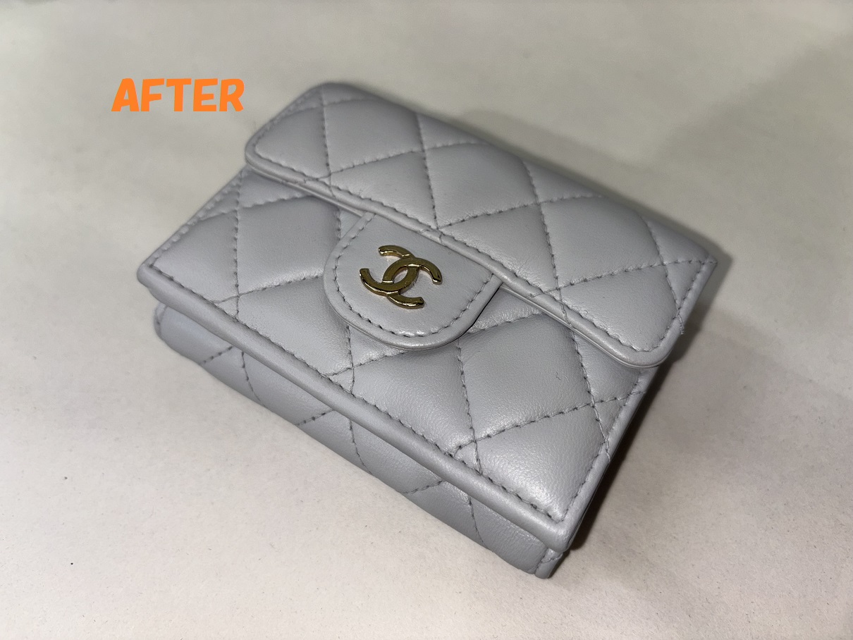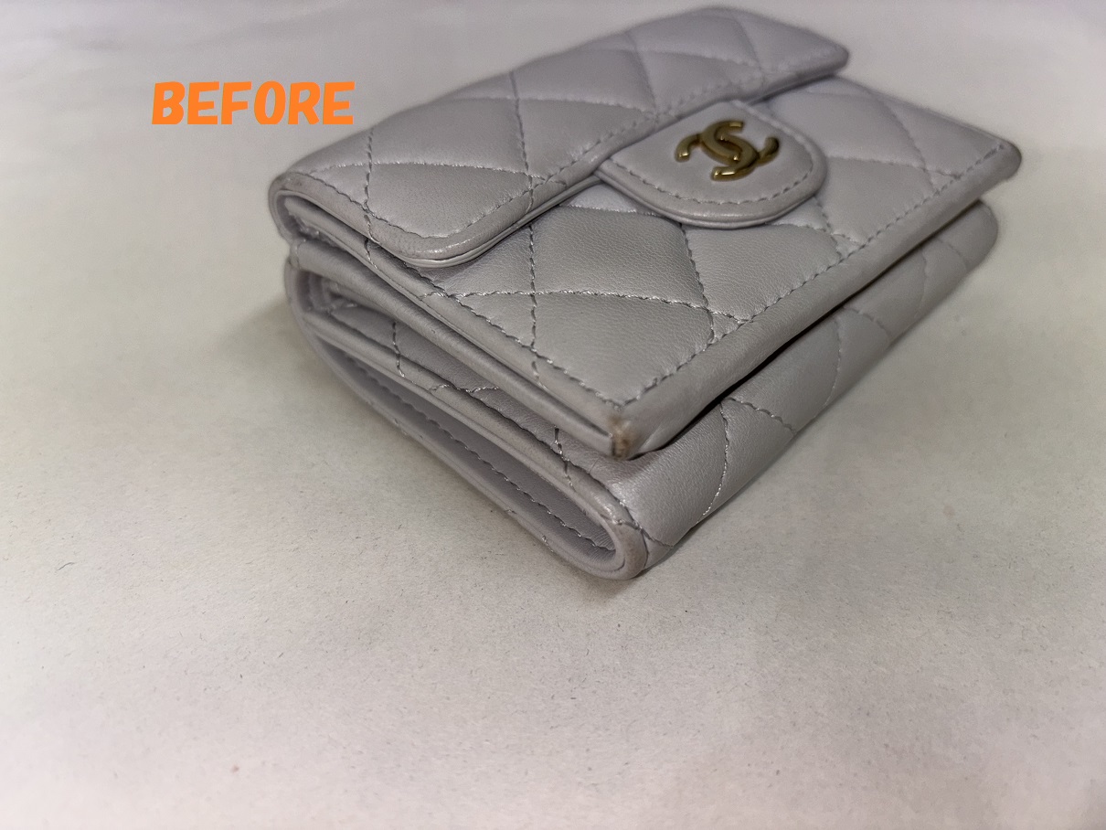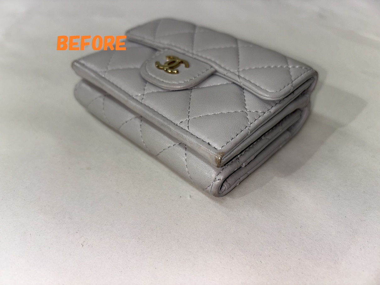 財布修理 CHANELシャネルのラムスキン 折りたたみ財布 角スレ補修 黒ずみ補修 染め直し