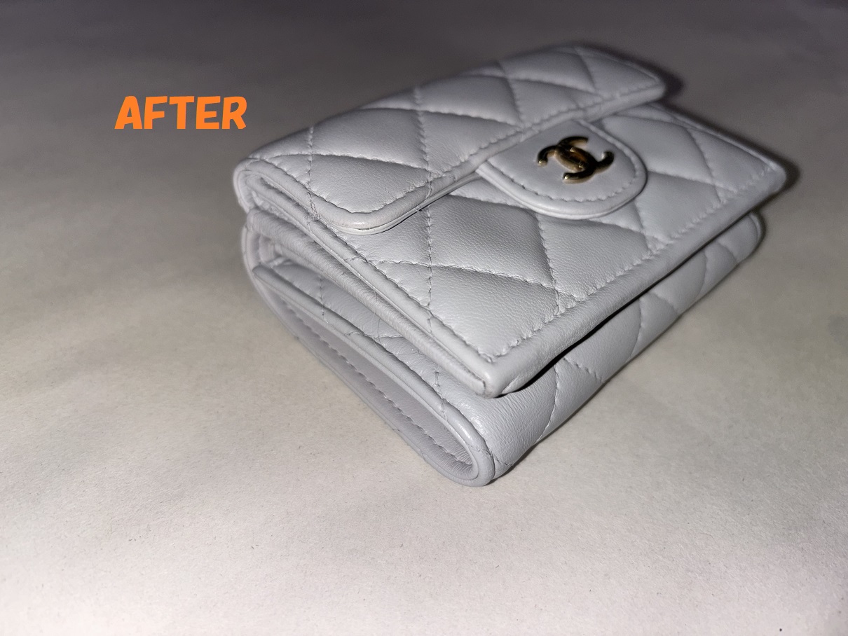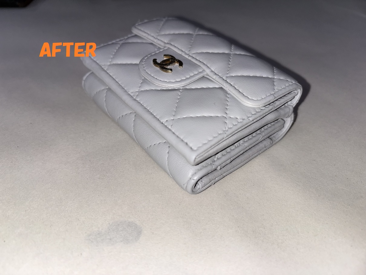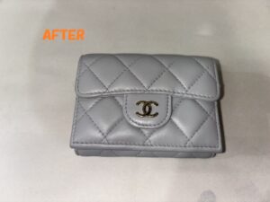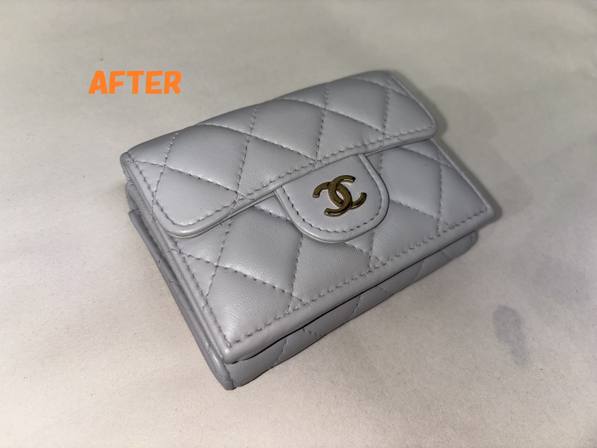 財布修理 CHANELシャネルのラムスキン 折りたたみ財布 角スレ補修 黒ずみ補修 染め直し