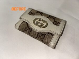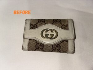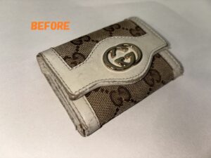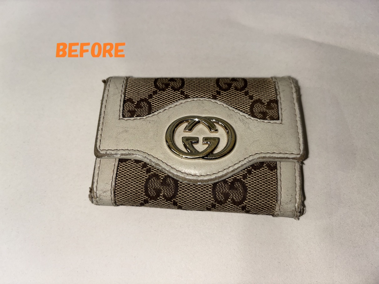 革財布(サイフ)、小銭入れ、キーケース等の小物全般の革のキズ、スレをキレイに修理いたします。CHANEL(シャネル)GUCCI(グッチ)等のブランド革小物の修理ももちろんOKです。
