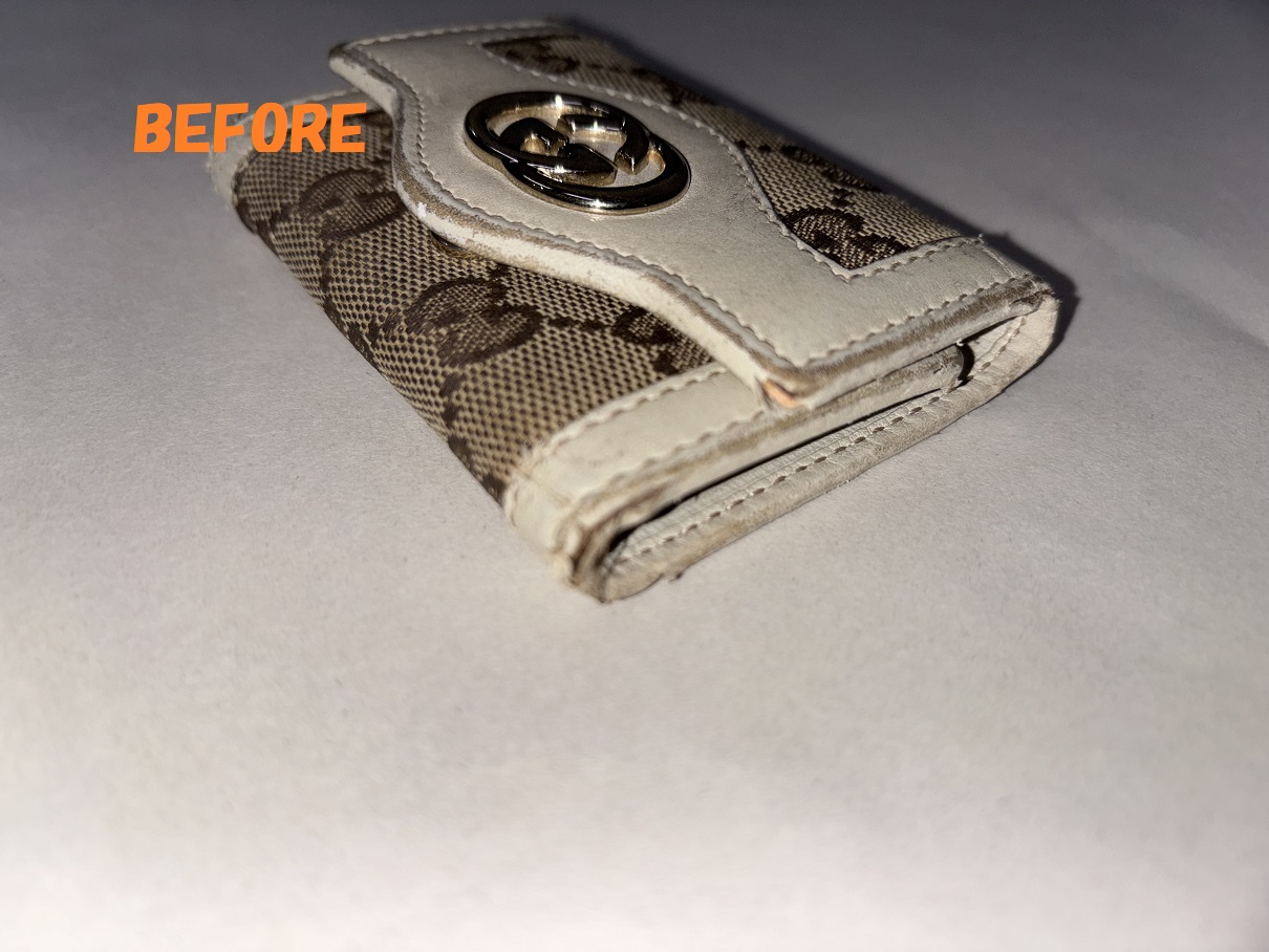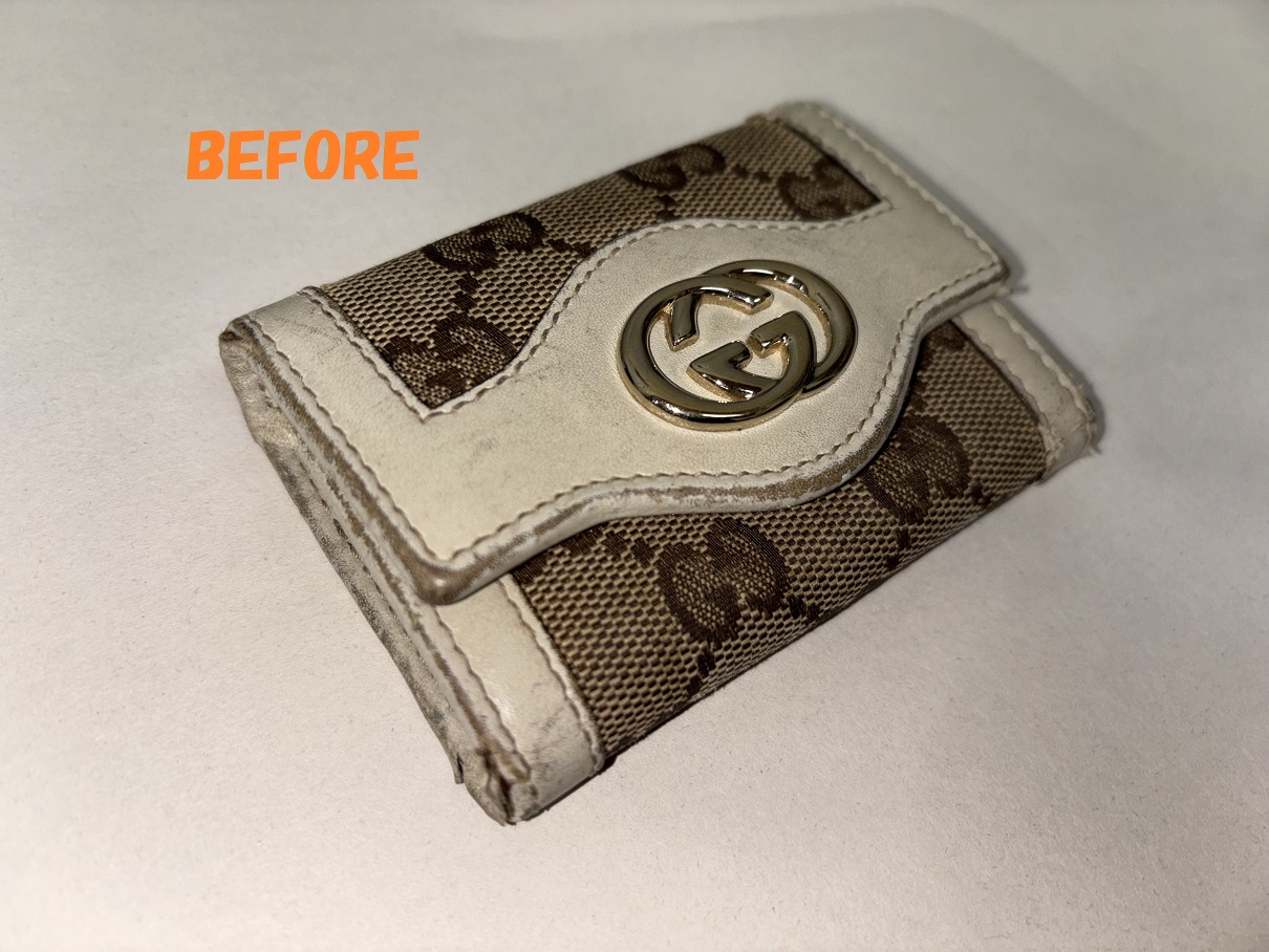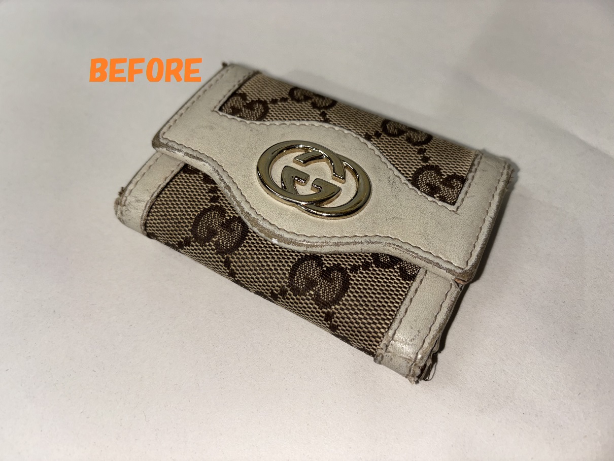 GUCCIグッチのキーケースの角スレ、破れの補修、黒ずみなどの修理、染め直しのご依頼を頂きましたので、ご紹介させていただきます(*^-^*)
