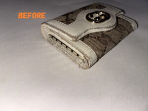さて、今回のご依頼なのですがGUCCIグッチのキーケースになります。キャンバスと革のコンビのキーケースですが、革の部分がかなり劣化しており、角部分が破れたり、スレたり、汚れてしまいました。大切なものなので何とかきれいにすることは出来ないかというご相談を頂きました。実物を拝見させて頂きましたところ、破れを接着剤などで貼り直しをして、樹脂系溶剤(硬いゴムのようなもの)を使って形を再生することでできるだけキレイに補修できるように思います。最後に染め直しをすることで綺麗に復活させることが出来るかと思いますので、頑張って修理をしたいと思います!!
