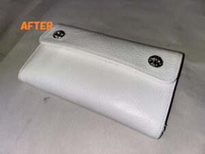 全体的に黒ずみや黄ばみが目立っていましたが、キレイになって真っ白なお財布に復活しました~!!