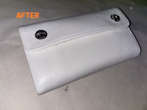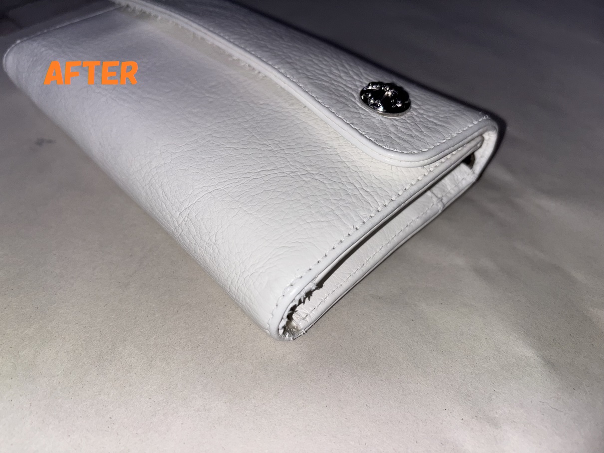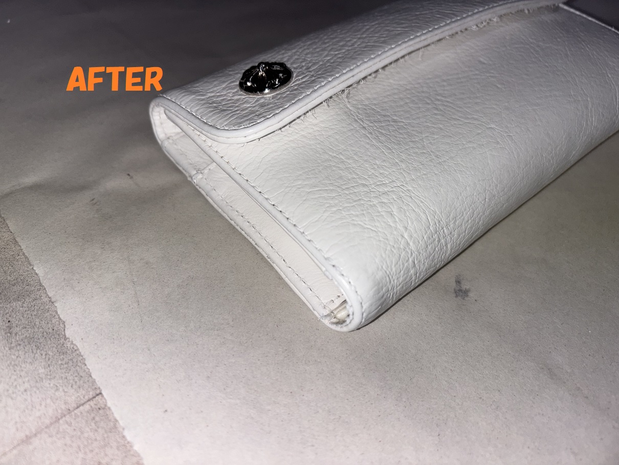 下処理がおわりましたので、次は染めの工程に入っていきます。今回のお財布はもともと真っ白だったという事で、白の塗料で着色していきます。白の塗料を調合して財布い塗布していきます。お色がハゲてしまった部分には特にしっかり目に着色していきます。クリーニングで汚れがほとんど落ちていますので、キレイに白く発色してくれました。すごくキレイになりました~!!